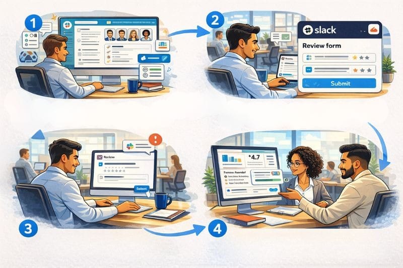 The manager or HR customizes reviews and sets up a review cycle. They choose reviewers (peers, managers, direct reports, customers) from Slack lists. Some tools will suggest reviewers based on channel interactions or past evaluations.
