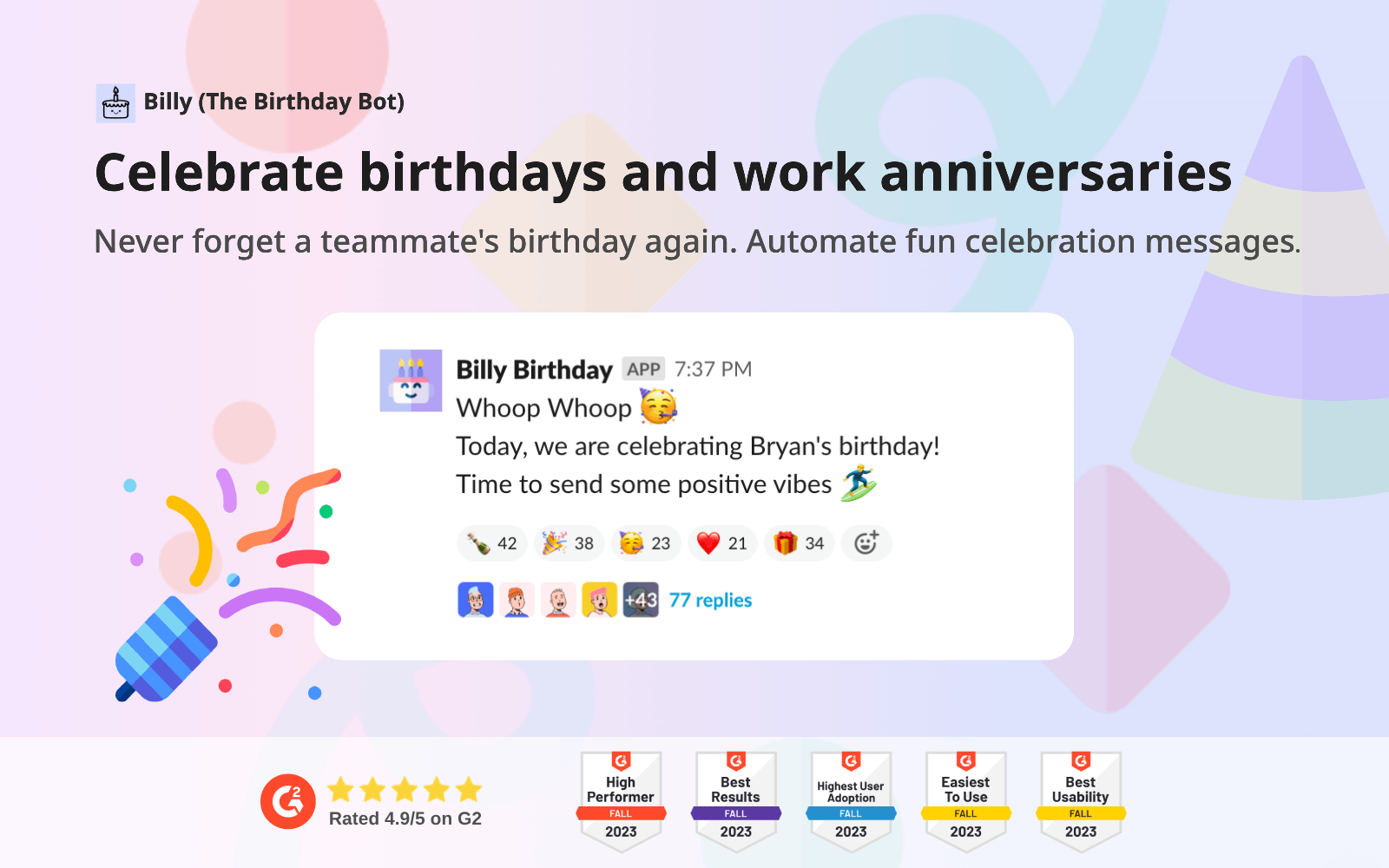 Billy automates birthday and work anniversary celebrations in Slack with a fun and customizable copywriting