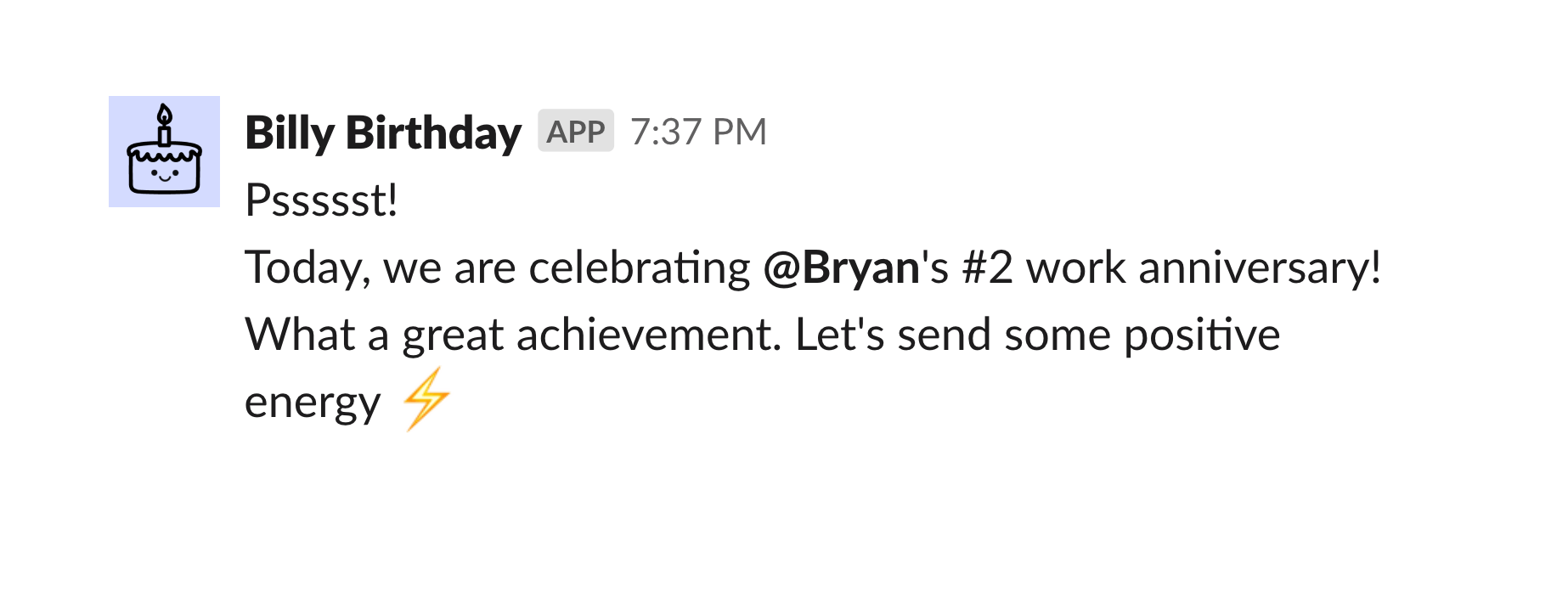 Billy is the best choice if you're looking for an employee anniversary app for Slack.