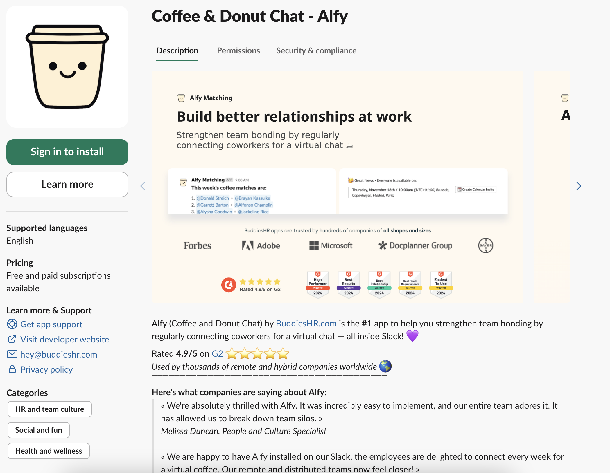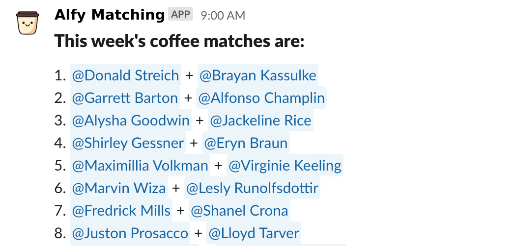 Alfy Matching is a Slack app that helps you automate casual virtual coffee chats among your employees. Define the frequency, group size and people will be matched together to have a 15min coffee chat.