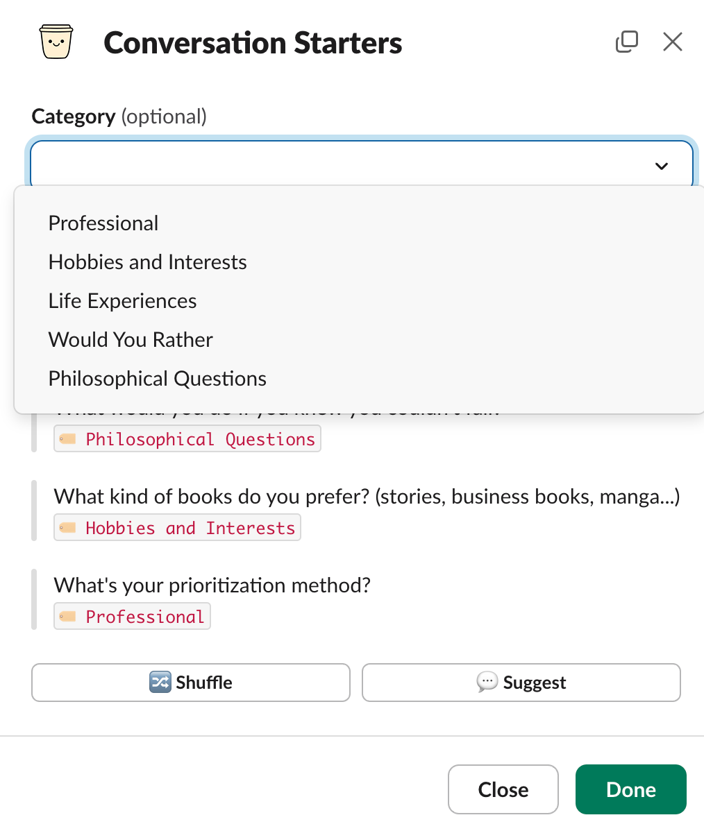 A watercooler app can bring more casual conversations into your Slack, giving people a chance to relax, connect, and feel part of a community—even when they're working remotely.