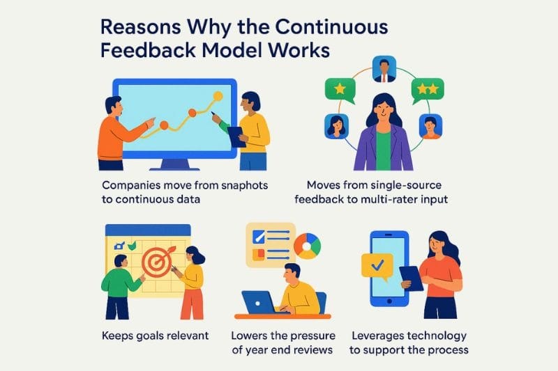 The continuous feedback process keeps employees focused on reaching goals and objectives. It serves as an early warning system for potential problems, offering a better alternative to annual performance appraisals. This model leads to a higher level of connection to company goals and career growth.