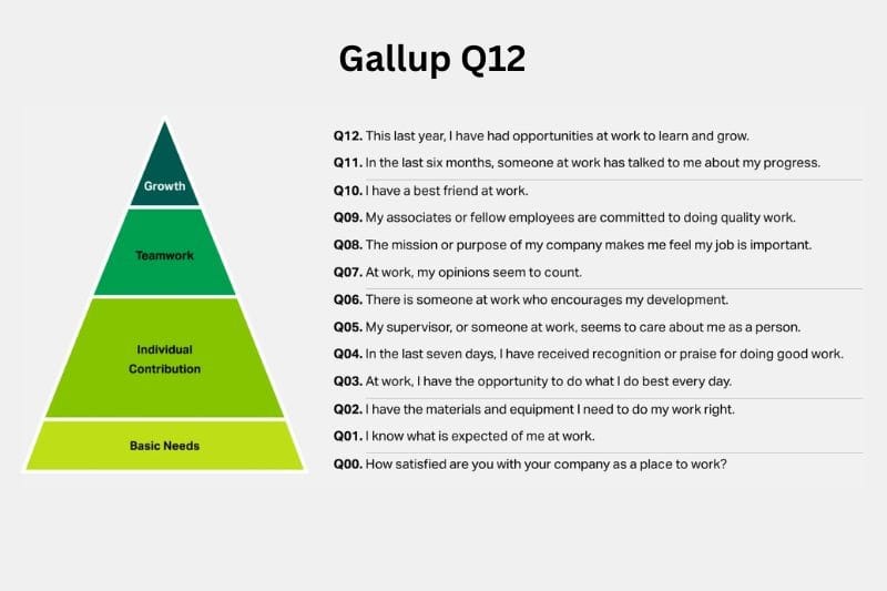 The work Gallup has done over 25 years gives insight and a clear direction into how to measure employee experience. Before setting up an employee satisfaction survey that tells you how your employees are doing, you need a tried and tested foundation for what creates employee engagement outcomes. Below is a summary of Gallup’s work on this subject.