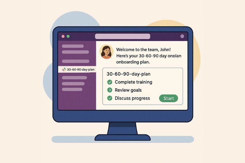 Successful onboarding doesn’t last only 7 days. If you want deeper integration into company culture and to ensure retention, a 30-60-90 day onboarding plan is the complete package. In Slack, you can automate the following touchpoints: