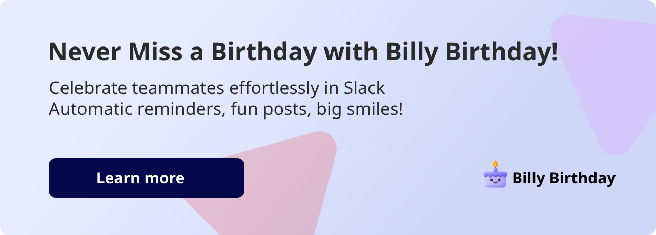 You’ll relate to what this BuddiesHR client had to say. ‘The worst feeling is interacting with a co-worker all day long and getting home to see on social media that it was actually their birthday.’ With Billy Birthday, you can automate birthday messages in Slack. Install Billy for free.
