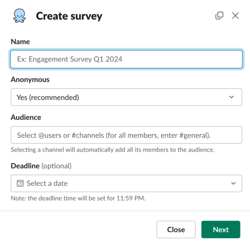 - Name your survey and choose the anonymous mode, audience and deadline (optional).