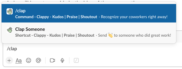 Step 2 – Type /clap anywhere in Slack to send Kudos