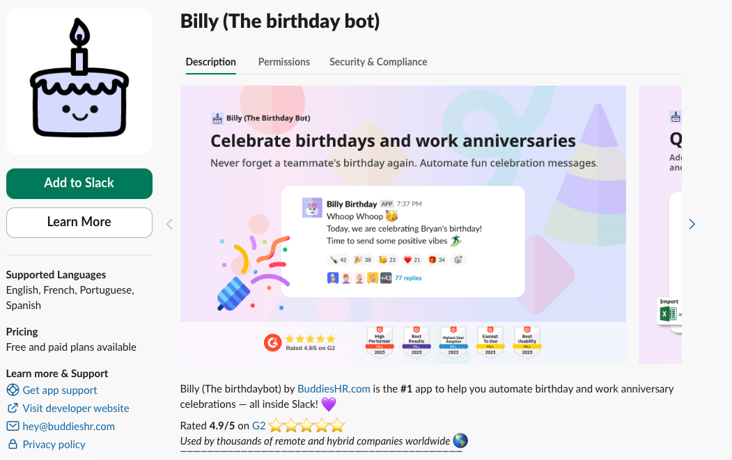 The first step to set up birthday reminders in Slack is to install a Birthday Bot to post the birthday reminders and celebration messages.
