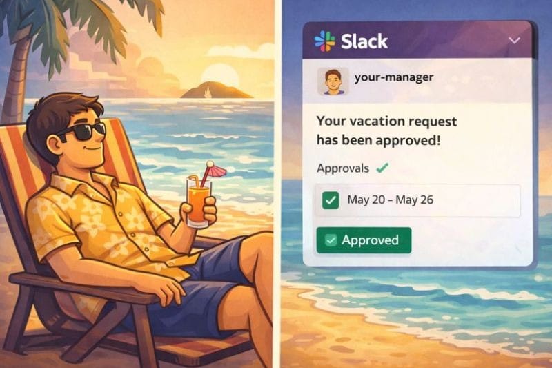 Set up a simple Slack workflow where employees submit vacation requests by using a form or using Palmy Vacation in Slack. Palmy completely removes the manual work of approving and managing vacation balances. With one-click approvals, calendar sync, and Slack status update, you’ll always be on top of PTO.