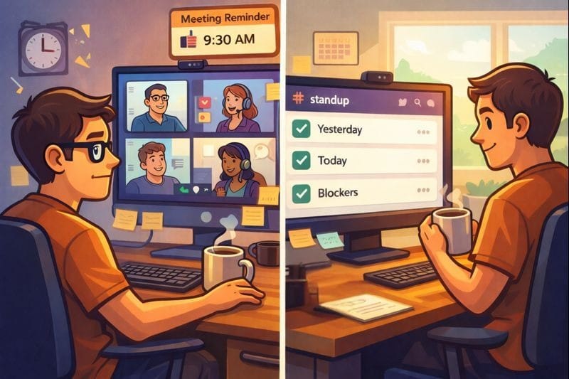 You started running daily check-ins in a video call, instead of in person. That felt like real progress. But here’s the truth: You’re still interrupting deep work to exchange information that doesn’t need a real-time conversation. Most stand-up feedback feels more like a Slack status broadcast than a conversation, and Slack can do this better than a meeting ever could.