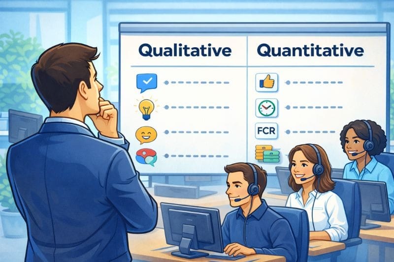 Previously, we mentioned that you should set clear and measurable performance criteria for customer service roles. To help you with this task, we’ve compiled a list of qualitative (measures observable behavior and service quality), and quantitative (measures performance data) criteria. The customer service performance review works better when it includes both aspects.