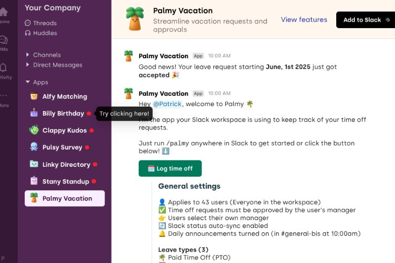 👋 Don’t waste time looking for a better solution - start using Palmy Vacation in Slack now.