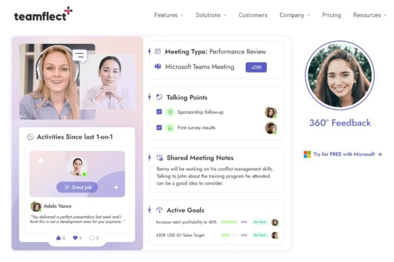 Teamflect is a big drawcard for companies that do everything in Microsoft Teams. Rather than asking employees to adapt to another platform, Teamflect brings performance reviews, 1:1 meetings, OKRs, reward programs, employee engagement, and advanced analytics into one place - MS Teams.
