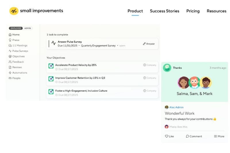 - Small Improvements: Balanced toolset (360 reviews, OKRs, 1:1 meetings) and pulse survey integration. Initial setup takes around 1 week.