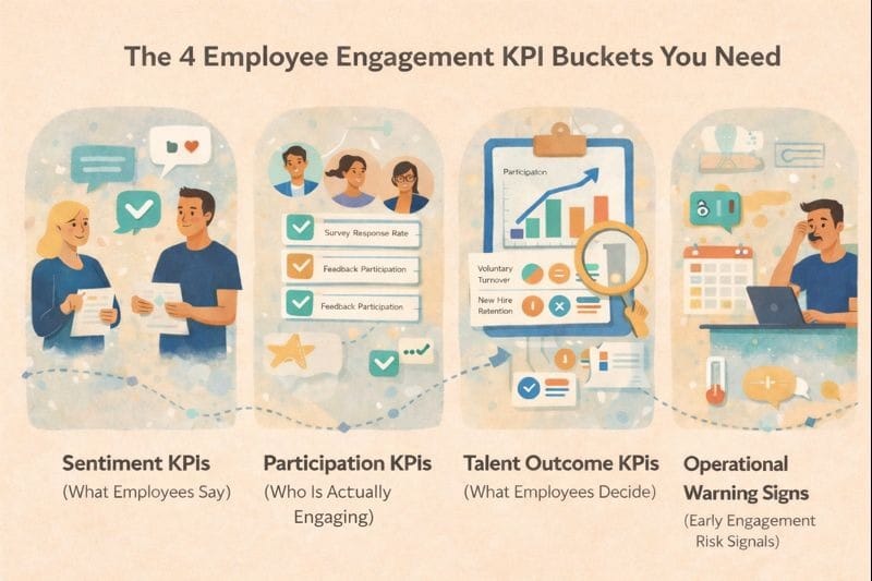 Employee engagement KPIs help HR teams measure how employees feel, how often they participate, and what outcomes follow (like retention and burnout risk). The best approach is to track a small set of KPIs across sentiment, participation, talent outcomes, and early warning signs, then act on the trends consistently.